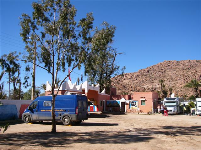 Zwischen Sonnenaufgang ... ... und Sonnenuntergang ändern sich die Farben der Felsen - und auch die Belegung des Platzes. Am dritten Tag ist alles abgetrocknet und durchgeharkt worden und abends stehen rechts von uns Wohnmobil an Wohnmobil - nur die Mitte ist noch frei. Das die sich am nächsten Tag auch noch füllt, wollen wir nicht erleben. So verabschieden wir uns von dem netten neuen Verwalter Mohamed Boualim ... ... und versorgen uns im nahegelegenen Stadtzentrum von Tafraout in den kleinen Geschäften noch mit frischem Hack- und Hühnerfleisch, Gemüse und anderen Lebensmitteln für die nächsten Tage.
