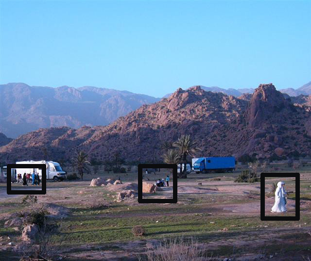 Es gibt auch eine Alternative zu den ummauerten Campingplätzen. Zum einen kann man direkt neben dem Campingplatz "Trois Palmiers" auf einer Fläche stehen, die zum Campingplatz gehört und die Sanitäranlagen und Stromanschlüsse des Platzes nutzen zum gleichen Preis wie innerhalb der Mauern. Und dann gibt es noch eine riesige Fläche abseits hinter einem Bach, auf der man gegen eine Tagesbühr von 10 Dirham frei stehen kann. Das wirkte nach der Ankunft auf dem Campingplatz recht idyllisch unter den Palmen und wir hatten in Erwägung gezogen, am nächsten Tag nach Nutzung von warmer Dusche und Ausguss für die WoMo-Toilette des Campingplatzes dorthin "umzuziehen". Wie gut, dass wir es nicht getan haben. Dieser freie Platz dient den Einwohner und vor allem den Kindern von Tafraout als kostenloses Freilichtmuseum zum Studium der Lebensweise europäischer Camper. Kinder sahen wir fast ständig auf dem Platz ... ... und am Samstag waren ganze Großfamilien dort unterwegs. Ob schwarz- ...