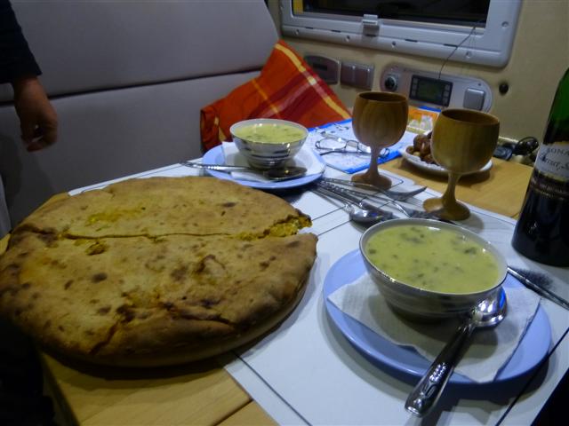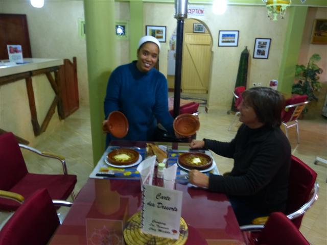 Zuvor wollen wir uns aber von der Ehefrau des Betreibers verwöhnen lassen. Wir erinnern uns noch genau an die leckeren Tajines und Brochettes vor vier Jahren. Diesmal bestellen wir Suppe und die Pizza local (Berber-Pizza) - beides jeweils pro Person - und nehmen gern den Vorschlag an, aufgrund der raschen Abkühlung am Abend das Essen in unserem Campingbus servieren zu lassen. Beides sehr lecker - aber wir wussten vorher nicht, wie groß die Pizza ist! Nach der gehaltvollen Suppe haben wir es zu zweit nicht geschafft, eine ganze Pizza zu vertilgen. Die zweite reichte noch für den nächsten Abend und den kleinen Mittagsimbiss am folgenden Tag! Nebenbei: EINE Riesenpizza kostet 40 Dirham!
