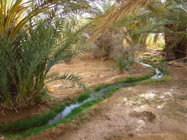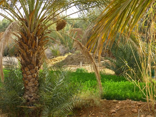 Mit ihm gehen wir über die schmalen Dämme in der Palmerie. Das sollte man keineswegs allein machen. Die Gärten sind natürlich Privateigentum und mit jedem Schritt besteht die Gefahr, dass die schmalen Erdwälle beschädigt werden! Einen guten Eindruck von der intensiven Landwirtschaft unter den Dattelpalmen hatten wir ja schon bei unserem Spaziergang an der Straße vom Campingplatz bis zur Ziz-Brücke und zurück bekommen. Jetzt sehen wir Flächen die zwecks Bewässerung komplett "geflutet" wurden.