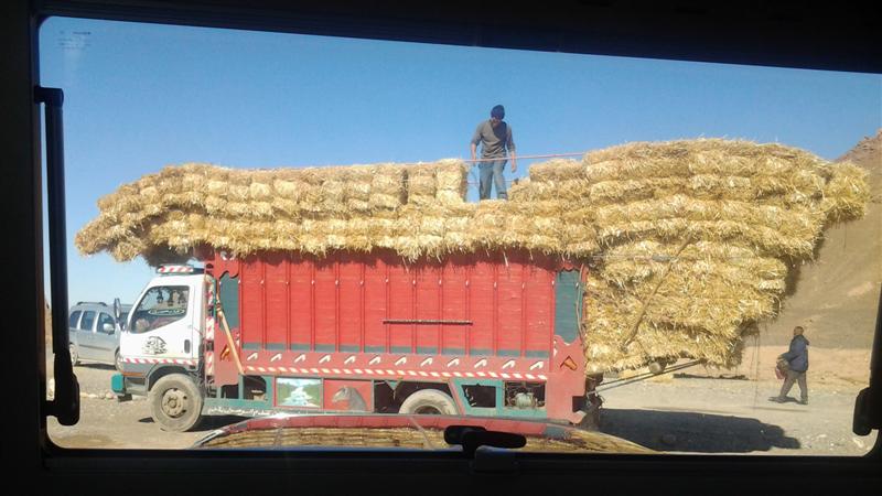 Als wird abfahren wollen beginnt man auf dem Parkplatz neben unserem Campingbus gerade mit dem Entladen eines der landestypischen Stroh-Transporter.