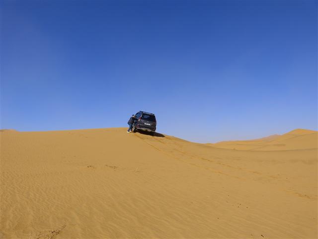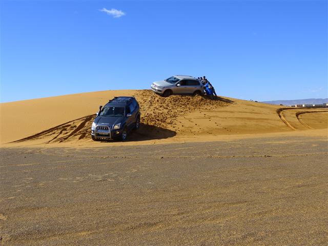 Wir haben mit Lahcen gerade die asphaltierte N 13 südlich von Merzouga erreicht, als wir auf einem nur wenige Meter hohen "Dünchen" neben der Straße einen hilfebedürftigen Touristen mit seinem Geländewagen entdecken. Nach wenigen Minuten wurde er aus seiner Not befreit. Der beste Geländewagen nutzt nichts, wenn es am "Blick" für die Festigkeit des Sandes und dem fahrerischen Können mangelt.