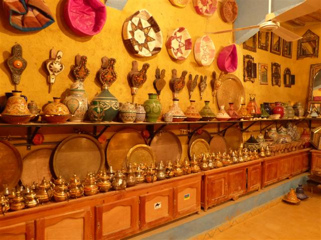 Depot Nomade - Hassilabiad/ Merzouga/ Erg ChebbiWie bei vorherigen Aufenthalten in Kasbah Mohayut besuchen wir am Ortsrand von Hassilabiad - etwa 1.000 m von Kasbah Mohayut entfernt - das Depot Nomade. Es ist erstaunlich, welch reiche Auswahl sich in dem unscheinbaren Haus in mehreren Räumen verbirgt. Statt das Angebot mit vielen Worten zu beschreiben zeige ich es einfach mit den nachstehenden Fotos. Eine Besonderheit - jedenfalls für marokkanische Verhältnisse: Man kann völlig ungestört von Verkäufern alles anschauen, man wird nicht bedrängt, etwas zu kaufen. Das Personal bleibt still im Hintergrund und wird nur aktiv, wenn man eine Frage hat.