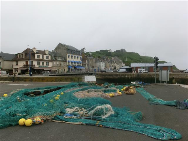 ... und wieder an Land geholt werden. Vom Parkplatz aus gesehen nach links darf man mit den Hunden an den Strand, nach rechts vor den Badehäuschen ist es verboten - was aber keinen Franzosen interessiert. Vor den weißen Häuschen liegen etliche "Entsorgungshäufchen" der Hunde. In Bernières-sur-Mer steht das "möglicherweise erste am 6. Juni 1946 befreite Haus Frankreichs" und einige Fotos aus der Zeit zeigen das damalige Geschehen, ... ... zum Beispiel deutsche Kriegsgefangene vor diesem Haus im Juni 1944 auf dem Weg nach England. 27. bis 29.06.2012 Bernières-sur-Mer - Port-en-Bessin - Isigny-sur-Mer - Cotentin-Halbinsel 118 kmAm nächsten Tag steht als erstes die Besichtigung von Port-en-Bessin auf unserem Programm. Wir parken nicht auf dem im WOMO-Führer (Tour 8 Platz 40) genanten Wohnmobil-Stellplatz von Port-en-Bessin sondern gehen nach dem Einkauf beim Super-U an der Küstenstraße nur ca. 200 m direkt zum Hafen und Zentrum des kleinen Ortes. Abgesehen von der kleinen Geschäftsstraße mit Andenkenläden und Restaurants ... bildet der Hafen die Hauptattraktion. Im äußeren Bereich liegen die Boote auf dem Trocknen.
