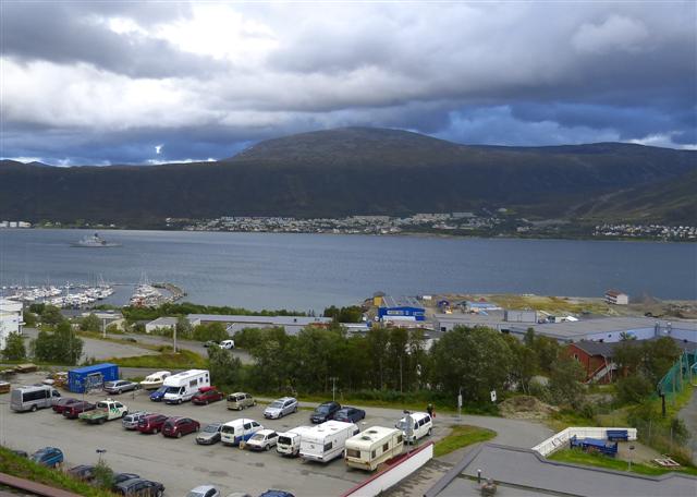 Bei überwiegend bewölktem Himmel und gelegentlichem leichten Regen fahren wir unserem Ziel entgegen, nutzen die in der Überschrift genannten Fähren, durchqueren Tromsö - und stehen im STAU! Wir sind in der Großstadt Tromsö - was nach den letzten Wochen in Wildnis und kleinen Orten eh schon ein Kulturschock ist. Am Freitagnachmittag gegen 17 Uhr wollen himmlische Heerscharen über die Kvaløysund-Brücke nach Westen und so stehen wir schon vor Erreichen des Flugplatzes im Stau und nur langsam geht es voran. Erst nach Überqueren der Brücke verteilen sich die Fahrzeuge nach Norden, Süden und in die Wohngebiete am Ostrand von Kvaløy.