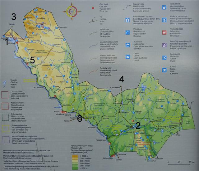 Rekordverdächtig ist auch die Kommune ENONTEKIÖ mit 1878 Einwohnern (Wikipedia), zu der Kilpisjärvi mit ca. 110 Einwohnern gehört. Kilpisjärvi (1) ist von Hetta (2), dem Hauptort, Verwaltungssitz und Geschäftszentrum Enontekiös ca. 165 km entfernt! Mit ca. 800 Einwohnern ist dieses Gemeindezentrum allerdings auch recht überschaubar :-). Dieser Teil Finnlands ragt wie ein Arm zwischen Norwegen und Schweden nach Nordwesten und wird deshalb auch mit dem finnischen Wort Käsivarsi für "Arm" bezeichnet. Die Gemeinde Enontekiö hat eine Außengrenze von 450 km zu den Nachbarstaaten Norwegen und Schweden!