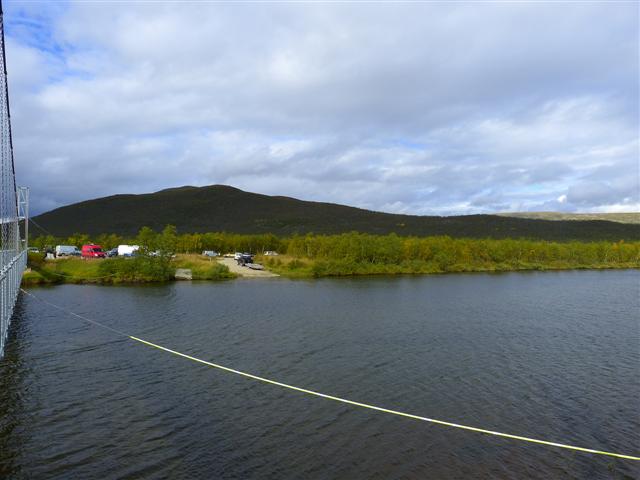 Etwas abseits der E8 finden wir einen fast vollständig gefüllten Parkplatz vor einer Hängebrücke. Wir suchen einen Aufenthaltsplatz in der Wildnis am Wasser für die nächsten Tage, hier gefällt es uns aber nicht.