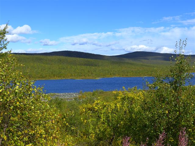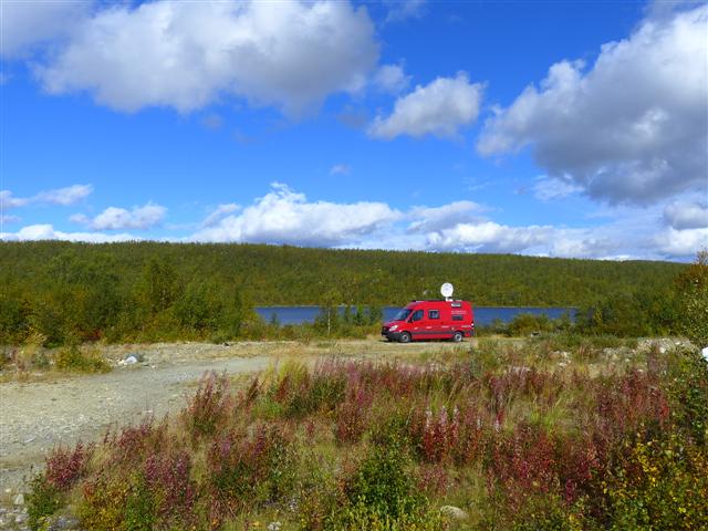 Weiter geht es Richtung Süden, bei Olderfjord erreichen wir die E 6 und fahren auf ihr bis in die Nähe des Sami-Dorfes Áisaroaivi. Hier finden wir einen Schotterplatz direkt am Fluss, umgeben von der inzwischen herbstlich gefärbten Vegetation. Es ist unglaublich, wie sich innerhalb der 4 Tage seit unserer Fahrt nach Norden hier die Laubfärbung verändert hat.