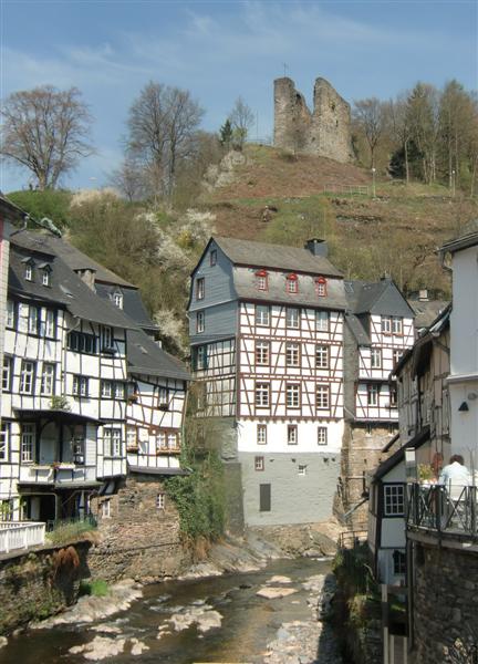 Hier beginnt das Zentrum Monschaus mit Fachwerkhäusern an der wildrauschenden Rur.