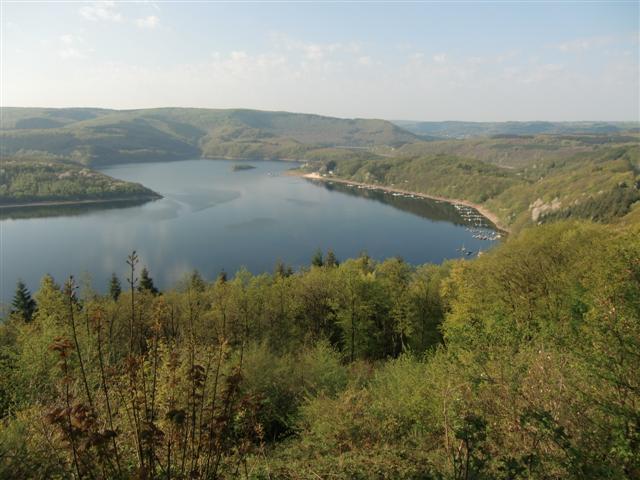 nach Rurberg, wo wir oberhalb des Sees eine ruhige Nacht verbringen (Platz 286). Danach treten wir die Heimreise an, "inspizieren" aber dabei noch einige Plätze in der Rureifel. Zunächst fahren wir nach Schmidt (der ORT heisst wirklich so) zum Platz 290 (WOMO-Führer Tour 13) ... ... und genießen von hier die Schöne Aussicht über See und Berge. Dann wollen wir uns noch die vier Wohnmobilstellplätze in Hürtgenwald anschauen, die wir in unseren Stellplatzführern Reisemobil International Bordatlas Deutschland und promobil Stellplatz-Atlas Deutschland gefunden haben. Ein Platz liegt direkt an der B 399 - den haben wir nur im Vorbeifahren gesehen. Der Stellplatz im Ortsteil Zerkall liegt in der Ruraue in der Nähe der Kallmündung, aber leider zwischen Landstraße und Bahndamm der Rurtalbahn. Blick von einer Fußgängerbrücke auf die Rur Von dort fahren wir ca. 4 km hoch hinauf nach Bergstein zum Parkplatz am Ende der Burgstraße. Leider ist der Platz sehr schief, ...