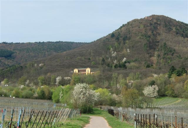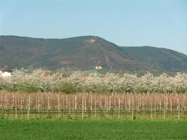Wir fahren wieder in Richtung Pfälzer Wald und sind begeistert von der Obstbaumblüte, hier im Hintergrund Villa Ludwigshöhe und die Rietburg.