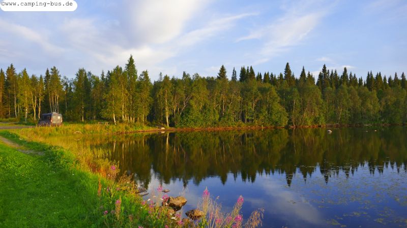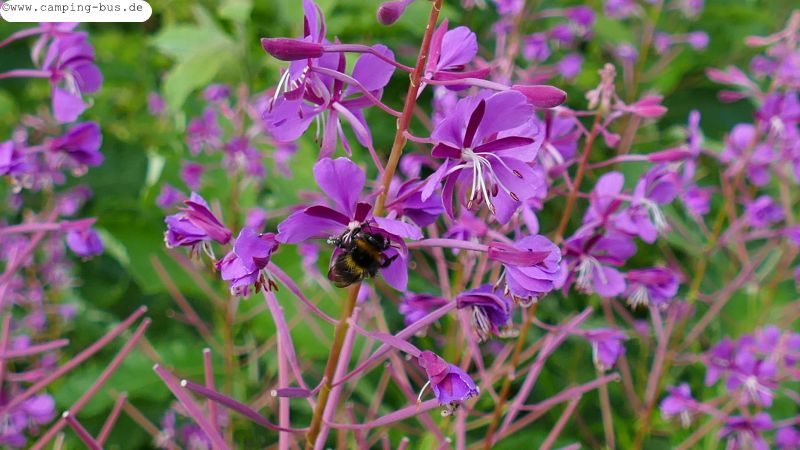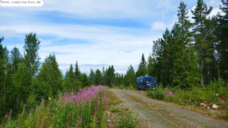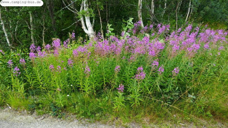 Wir verlassen den Vildmarksvägen an einer Brücke über die rauschenden Stromschnellen und finden hier einen ruhigen Parkplatz zwischen blühenden Weidenröschen und summenden Hummeln.