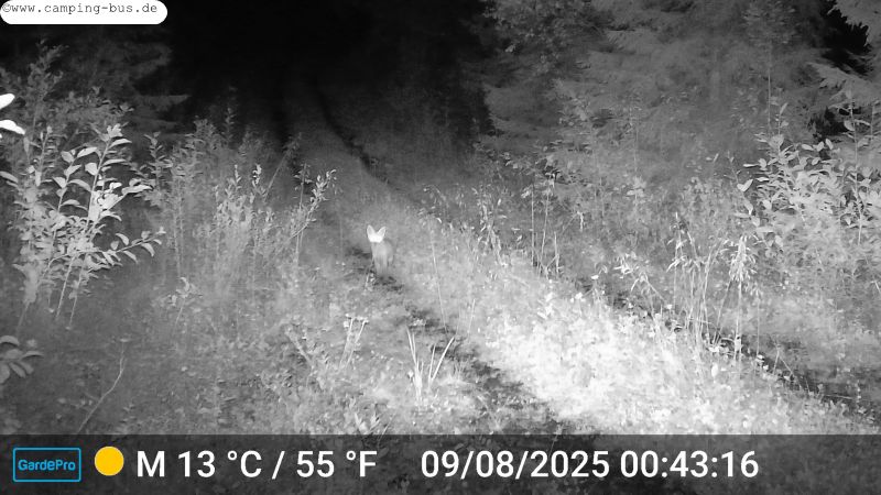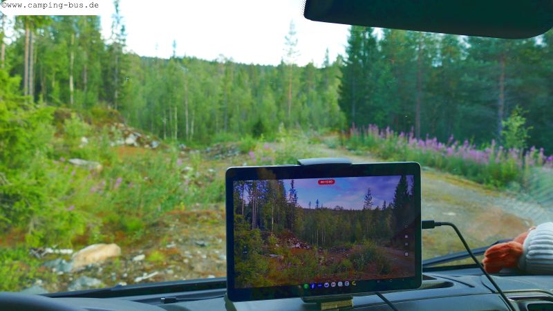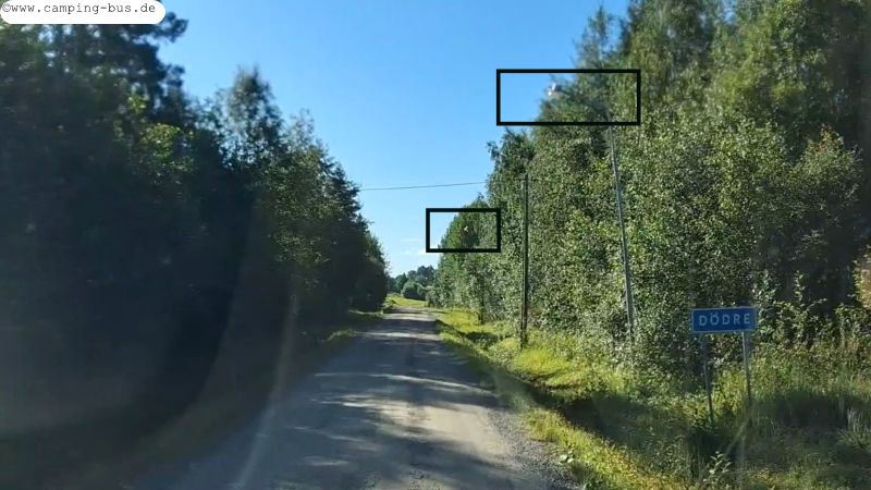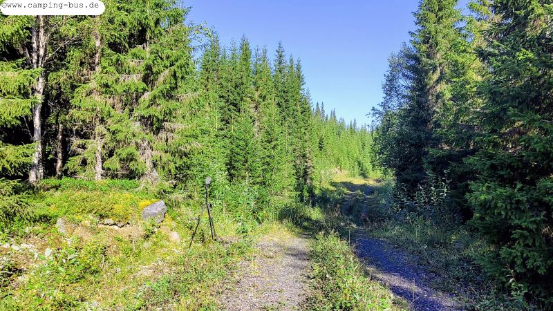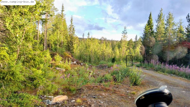 Also gucken wir abwechselnd hinten und vorne aus unserem Campingbus. Die Kamera des Tablets läuft und in der Kurve steht das Stativ mit der Wildkamera für den nächsten Abschnitt des Weges. Das Ergebnis: NICHTS! Auch keine Autos und Menschen, deren Persönlichkeitsrechte wir durch die Aufnahmen verletzten könnten. Der Weg endet nach einigen hundert Metern an einer Wendeschleife. Nun ist dieses Schweden ja ziemlich groß und hat ganz viel Wald. Warum sollte ein Tier ausgerechnet jetzt und hier vor einer unserer Kameras vorbei laufen? Andererseits: Warum nicht? :-)