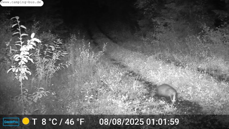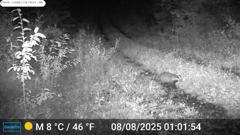Endlich ein Erfolgserlebnis - die Wildkamera erwischt einen Dachs. Kurz vorher hat schon ein Fuchs den Auslöser betätigt. 178 Kilometer nach unserem vergeblichen Warten auf Elch und Bär gelingen einige Nachtaufnahmen. Die Kamera habe ich ca. 500 m von unserem Platz entfernt in einem Waldweg aufgestellt.