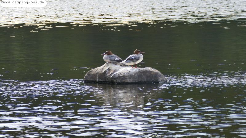 Unsere einzigen Nachbarn sind zwei Pfeifenten auf einem kleinen Felsen im See. Während unseres zweitägigen Aufenthalts fahren am ersten Abend Angler auf den See, am zweiten Nachmittag drehen Paddler eine kleine Runde.