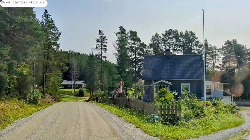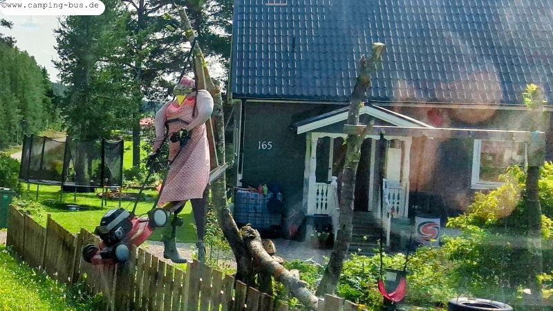 09./10.08. Föllinge - Östersund - Näkten / Tunvågen 107 kmEigentlich haben wir am Samstag wieder einen Platz am See als Ziel. Nach einem Einkaufsstopp in Östersund fahren wir auf die Ostseite des 40 Kilometer langen Sees Näkten. An einem Gartenzaun hat man eine Frau mit Rasenmäher aufgehängt Humor haben manche Schweden :-)