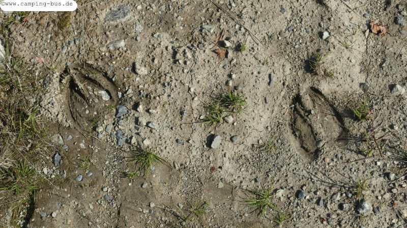 Sogar etwas Landschaft sehen wir aus dem Platz mitten im Wald. Aber viel wichtiger: Vor und hinter uns haben wir den Weg im Blick. An mehreren Stellen vor unserem Platz bis zur nächsten Kurve und dahinter liegt Elchkot und etliche Hufabdrücke von der Überquerung des Weges sind deutlich zu erkennen.