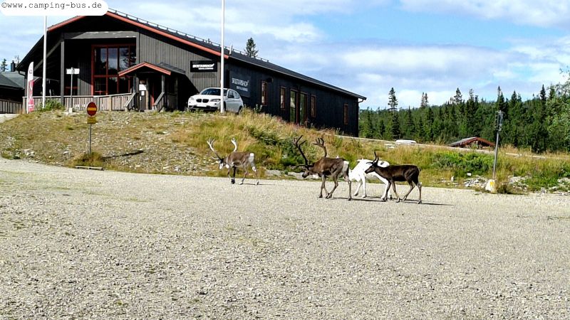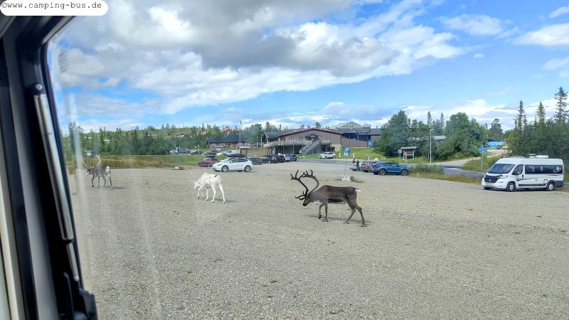 Trotz der verlockenden Lage des Stellplatzes fahren wir weiter. Wir wollen nochmal höher hinaus und hoffen auf eine letzte Begegnung mit Rentieren vor dem weiteren Weg nach Süden. Volltreffer, die kommen kurz nach unserer Ankunft auf den Parkplatz im Skigebiet Storhogna zu unserer Begrüßung.