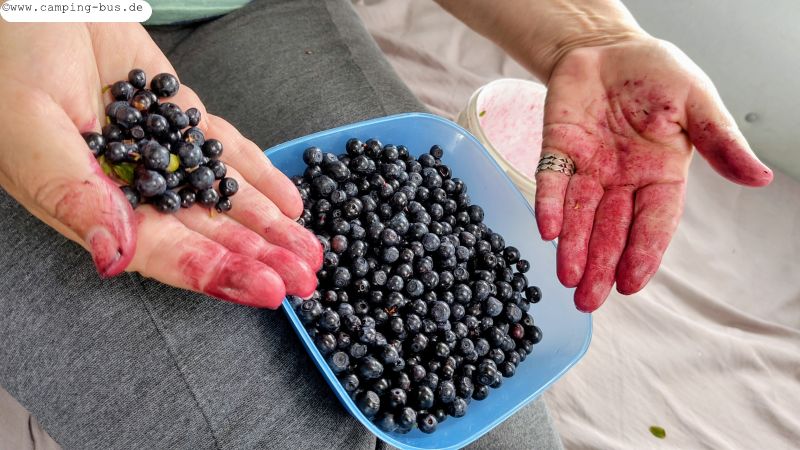 Bevor sie uns alle leckeren Blaubeeren wegfressen, schlägt Gaby sich zur Ernte in die Büsche. :-)