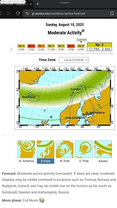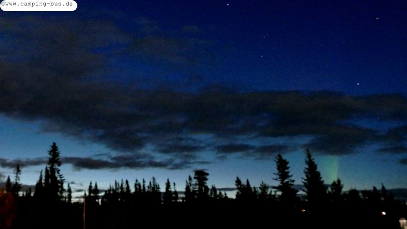 Den Platz haben wir uns nicht nur wegen der Hoffnung auf Rentiere sondern auch wegen der Polarlicht-Prognose ausgesucht. Die ist nämlich recht gut, die Wetterprognose auch und hier soll es zum ersten Mal in diesem Sommer die astronomische Dämmerung geben, von 00:49 Uhr bis 01:27 Uhr. Ob das dunkel genug ist für Polarlicht?