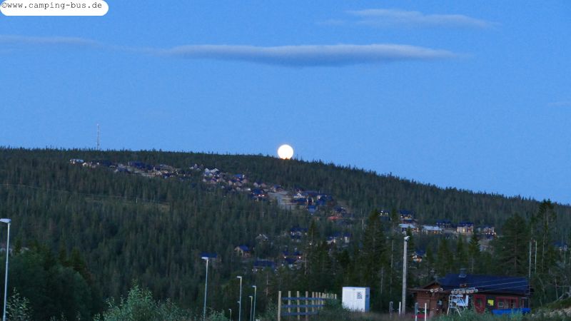 10./11.08. Näkten / Tunvågen - Gillhov - Klövsjö - Storhogna 106 kmRentiere, Polarlicht, Leuchtende Nachtwolken, VollmondSonntagmorgen setzen wir unsere Reise fort. Immer wieder eine kleine Überraschung, wenn man nach langer Schotterstraßenfahrt durch den Wald plötzlich Straßenlampen sieht. Die Häuser der "Orte" liegen oft versteckt hinter den Bäumen und sind kaum zu sehen.