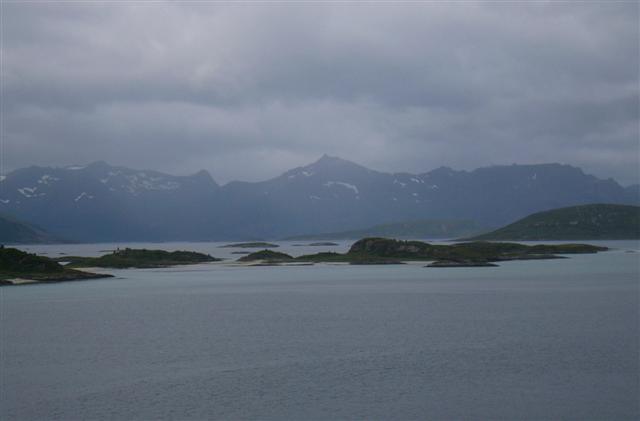 Beide Inseln zeichnen sich durch eine Vielzahl von Stränden und winzigen vorgelagerten Inselchen aus, hier der Blick von Sommarøy nach Süden zu den Bergen der großen Insel Senja. Von Karlsøy führt eine große aber schmale Brücke im ampelgesteuerten Einbahnstraßenverkehr zur Sommerinsel (=Sommarøy), die aber wettermäßig eher an einen Oktobertag an der Nordsee erinnert.