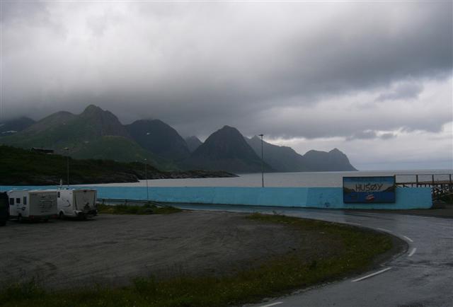 Wir verlassen die kleinen Inseln mit den markanten Felsen am Südwestrand von Kvaløy mit der Fähre von Brensholmen nach Botnhamn auf Senja. Erstaunt nehmen wir die Preistabelle zur Kennnis: Wir kommen für unseren 5,99 m langen Sol y Sombra mit 175 NOK davon. Wer ein 2 cm längeres Fahrzeug hat muss fast das Doppelte zahlen. Eine abwechslungsreiche Fahrt erwartet uns auf Senja. Vor allem Tunnel sind beliebt, denn eine echte Küstenstraße zur Umrundung der Insel zu bauen wäre angesichts solcher steil abfallender und weit ins Meer ragender Felsen wohl noch aufwändiger. Aber mehrmals geht es hoch hinaus und ebenso wieder abwärts ... ... mit tollen Ausblicken, die nur durch das Wetter etwas getrübt werden. Um das zu verdeutlichen hier das Foto mit ganz viel Wolken bei der Fahrt hinab nach Husøy ...