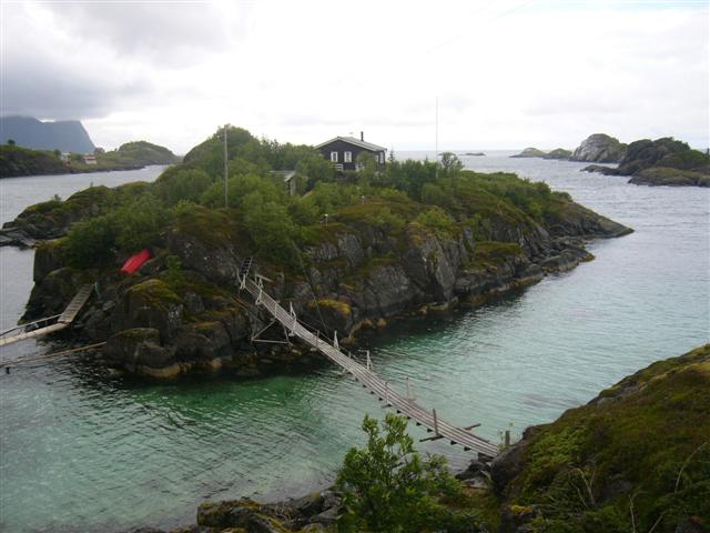 ... und dann etliche Kilometer an der Küste entlang. Bei Hamn i Senja sehen wir diese Privatinsel mit eigener Brücke und links am Bildrand dem Bootsanleger. Welche Zuwegung erfordert bei Sturm wohl mehr Mut?