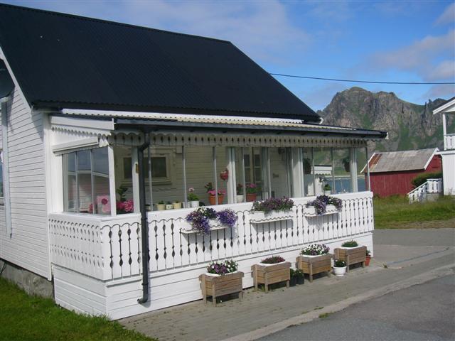 Am Freitagnachmittag ist die Wetter-Welt wieder in Ordnung, die Wolken ziehen in Richtung Norden davon. Der Vogelfelsen Bleikøya wird von der Sonne angestrahlt ... ... und ebenso der weiße Sand am Strand. Südlich vom Hafen führt ein schmaler Fußweg ... ... an Wollgrasbüscheln vorbei ans Meer. Wir gehen durch den Ort zurück zum Campingplatz auf der Nordseite. Wie schon in anderen Wohngebieten im Norden Norwegens wundern wir uns über die vielen Terrassen an den Häusern. Balkone mit Gartenmöbeln gibt es fast an jedem Haus. Manchmal gibt es schönen Blumenschmuck in den Gärten oder wie hier in Blumenkästen an der Straße. Dazu kommt die skandinavientypische Farbvielfalt der Gebäude. Am Donnerstag war der Campingplatz kaum belegt, am Freitagnachmittag füllt er sich innerhalb kürzester Zeit und vor allem die erste Reihe am Strand ist rasch "dicht". Die Verbindung von schönem Wetter und Wochenende lockt die Menschen nicht nur auf den Platz ...