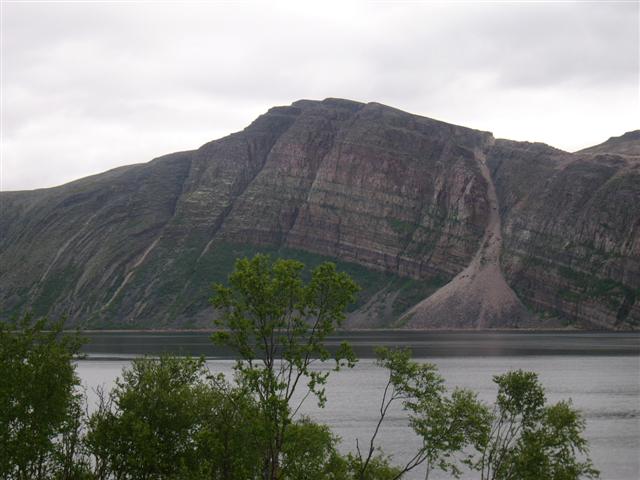 Wesentlich schöner sieht das alte Kaufmannshaus an der Straße 890 aus, in dem man während der Sommersaison auch zu Kaffee und Kuchen einkehren kann. 26.06.2011 Kongsfjord - Tana - Ifjordfjellet 170 kmWir fahren durch das Kongsfjordtal aufwärts in die Fjellregion, diesmal aber bei bedecktem Himmel. Hier sieht man den Fluss, der zu den lachsreichsten der Finnmark gehören soll. Wie schon bei der Hinfahrt fasziniert uns der Kontrast: Hier auf der Nordseite der Varanger-Halbinsel nur spärliche Vegetation, ... ... am Fluss auf der Südseite dichter Wald soweit das Auge reicht. Wenn man den Ausläufer des Tanafjordes bei Austertana erreicht, erkennt man an diesem Felsmassiv sehr schön die Verschiebungen der Gesteinsschichten. Wir fahren weiter talaufwärts bis zur Brücke über den Tana-Fluss. Die Straße führt zunächst an den Ausläufern des Tanafjords entlang, ... ..., bevor sie dann rasch auf die Höhen des Ifjordfjells aufsteigt. Die Strecke ab Vestertana befindet sich in sehr schlechtem Zustand. Es gibt zwar kaum Schlaglöcher, aber sehr starke "Schwellen", die man manchmal erst im letzten Augenblick erkennt und die denen in Tempo-30-Zonen an Fußgängerüberwegen entsprechen. Erst etwa 10 km vor Ifjord sind Bauarbeiten zur kompletten Erneuerung der Fahrbahn im Gange. Wie schon bei der Überquerung der Varanger-Halbinsel von Tana nach Berlevag beeindruckt uns wieder der Wechsel der Vegetation. Ab etwa 100 Höhenmetern geht der üppige Wald in zunehmend dürren Birkenbewuchs über und bei 200 m ist dann die Baumgrenze erreicht. Aber so ganz stimmt diese Aussage nicht, denn wenn man genau hinschaut, wachsen auch hier noch Bäume/Birken. Aber sie kriechen flach am Boden und sind teilweise noch kahl, ...