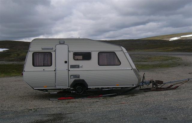 ... und auf diesem einen Wohnwagen. Aber was für einen?! Er hat keine Räder, sondern Kufen! Auf einem Schneefeld in der Nähe finden wir später seine Standspuren vom Winter. Na klar, zum Wintercamping hinter das Schneemobil spannen und ab in die Natur. Von diesem Parkplatz führt eine Schotterpiste zu einer Fläche etwa 100 m von der Straße entfernt - perfekt für unsere Fjellübernachtung.