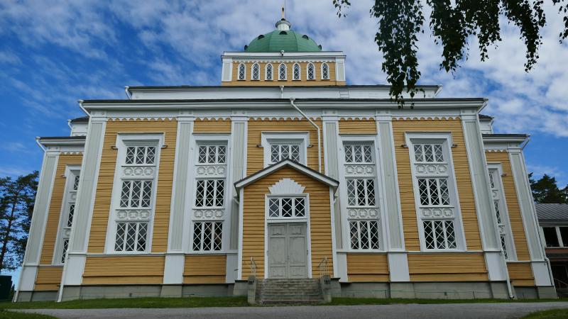 In Tohmajärvi schauen wir uns die schöne evangelische Holzkirche an, sie liegt auf einem Hügel mit Seeblick.