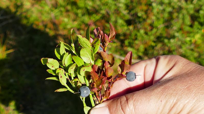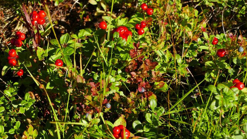 Jetzt ist auch die Zeit, in der die Preiselbeeren reif werden. In diesem Bild zeigt Gaby reife (rot) und unreife (hell).