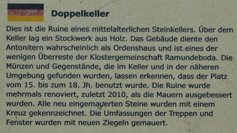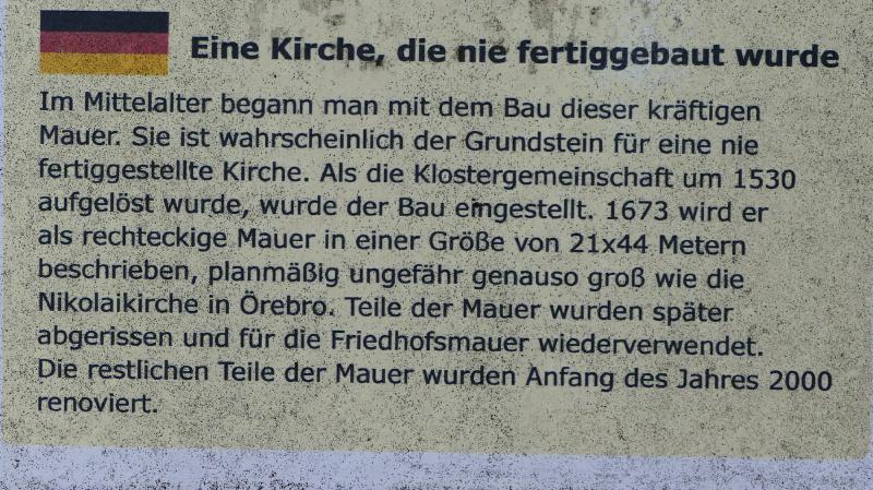 Einige Kilometer westlich von Laxå liegt direkt an der E 20 die Klosterruine am alten Rastplatz Ramundeboda. Der Parkplatz wäre auch heute gut als Rast- und Übernachtungsplatz geeignet wenn es nicht den Verkehrslärm von der vielbefahrenen Europastraße gäbe.