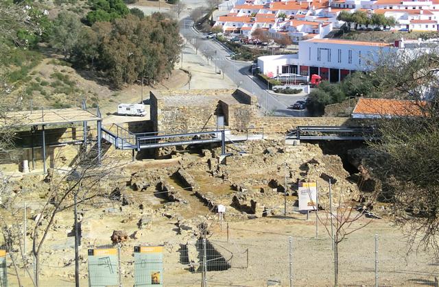 Vom Kastell aus blickt man auf die Ausgrabungen der maurischen Siedlung, die ebenfalls besichtigt werden kann. Links vom Wachturm sieht man ein Wohnmobil - der Parkplatz unterhalb wird im Stellplatzatlas Europa als einer von drei Übernachtungsplätzen genannt.