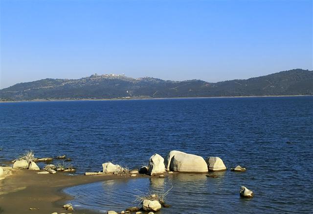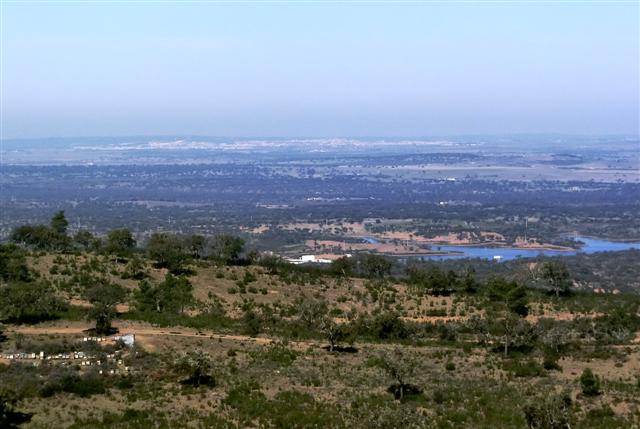 Monsaraz ist dabei im wahrsten Sinne des Wortes aufgrund seiner Berglage besonders "hervorragend", hier von der Brücke über den Barragem de Alqueva aus fotografiert.