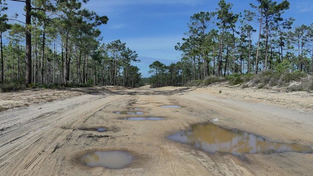 An der Westküste führen manchmal kilometerlange Pisten zu Strandparkplätzen - wer hier mit dem Wohnmobil fährt hat am Ziel evtl. nicht mehr alle Tassen im Schrank :-) Auch wenn man es bei dem vorstehenden Bild kaum glaubt - unter den Bäumen abseits der Piste blüht es: Bei Sines gibt es einige Parkplätze an Strandrestaurants in schöner Lage an der langen Sandstrand-Küste Der Containerhafen in Sines ist fast immer belegt, die nächsten Frachter liegen schon auf Reede und warten. Der bisher auch von Wohnmobilen genutzte Parkplatz am Praia Grande in Porto Covo wird zum PKW-Parkplatz umgebaut. Trotzdem bleibt Porto Covo einer unser Lieblingsorte in Portugal.