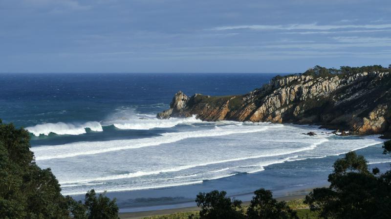 Links sind die Wellen in der Bucht kleiner. Für eine natürliche Dusche auf dem Weg vor den Felsen reicht es aber noch.