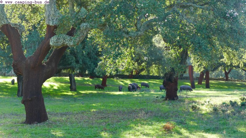 Iberische Schweine sind hier auch wieder unterwegs. Aber im Gegensatz zu den anderen am Vortag laufen diese panisch davon statt neugierig auf mich zuzugehen.