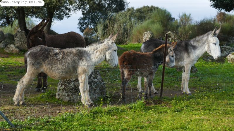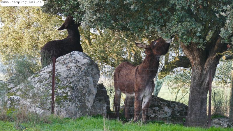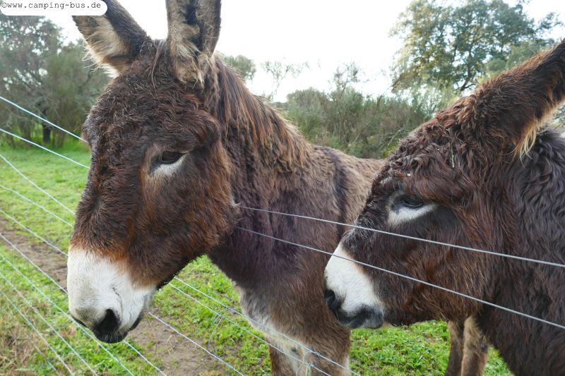Hinter dem Zaun an unserem Parkplatz bevorzugen zwei Esel Steineichen statt frisches Grün unter ihren Hufen. Als ich an den Zaun komme ist es aber wichtiger, gekrault zu werden als zu fressen :-)