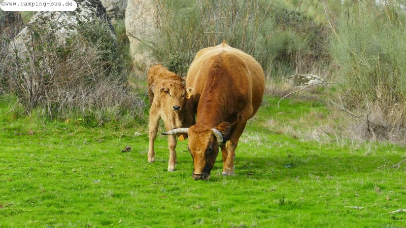 Tierische Felsskulpturen, echte Störche auf Felsen und eine Felsskulptur von Menschenhand Bei unserem Spaziergang durch die Welt der versteinerten Tiere von Los Barruecos müssen wir den gut angelegten und ausgeschilderten Weg mit einer frei laufenden Kuhherde teilen. Hier versuchen wir nicht, Mutter und Kind zu kraulen - das könnte gefährlich werden.