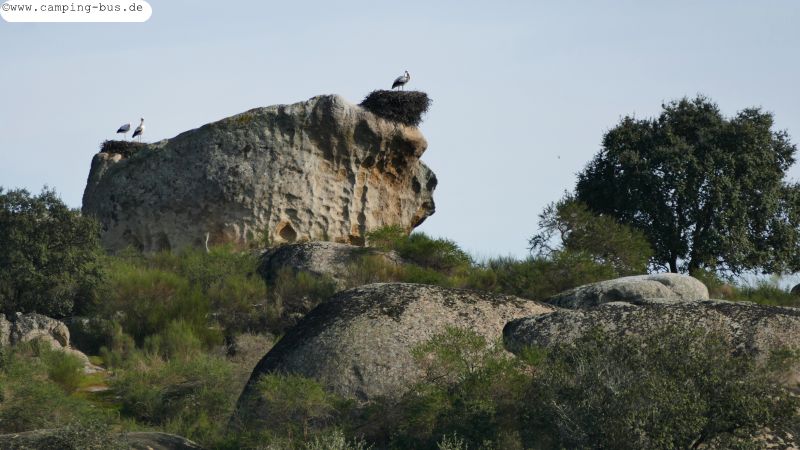 Auf den höheren Felsen gibt es viele Nester von und mit Weißstörchen.