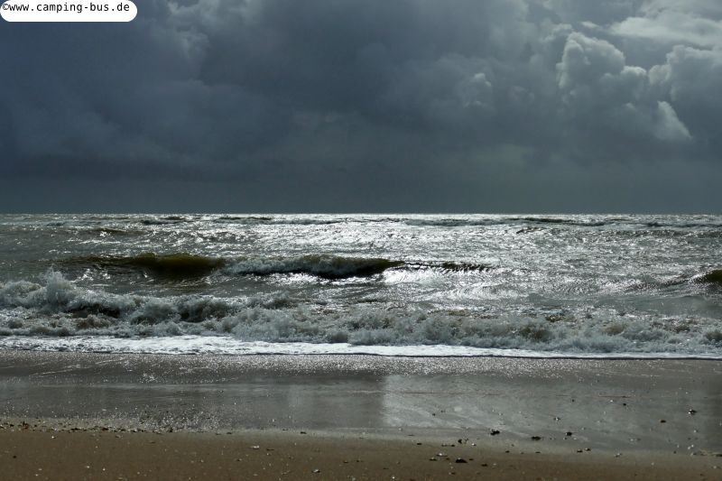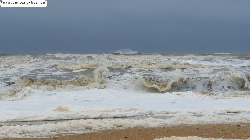 Der Wind bläst aus West-Südwest und trifft nicht frontal auf die Küstenlinie - man sieht, die Wellen kommen von der Seite. Ansonsten würden Wasser und Wellen sicher erheblich höher steigen.