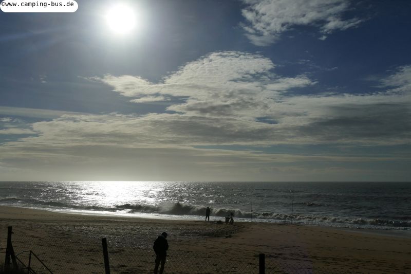 25. bis 28.01. La Palma del Condado - Islantilla 84 kmSeit Beginn unserer Reise haben wir ja unglaublich Glück mit dem Wetter gehabt. Aus allen Regionen der iberischen Halbinsel erreichen uns seit Ende Dezember Meldungen über Regen und Sturm während wir ganz überwiegend von der Sonne verwöhnt werden. Das wird sich nun aber nach den Wetterprognosen auch bei uns für die nächsten Tage ändern. Wir versuchen, windgeschützte Plätze mit festem Untergrund zu finden und fahren Sonntag wieder auf den Strandparkplatz Islantilla, auf dem wir bereits vor einer Woche waren. Dramatische Wolken über dem glänzenden Meer empfangen uns hier.
