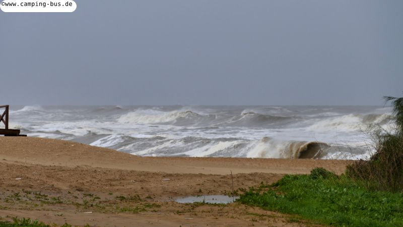 Als der Wind nachlässt gehe ich nochmal an den Strand, danach beschließen wir spontan, jetzt die Costa de la Luz zu verlassen. Für die nächsten Tage werden nur noch Böen bis 60 km/h angekündigt. Die vorerst höchsten Wellen haben wir also gesehen. Das Hauptziel unserer Reise ist ja Galicien! Also machen wir uns auf den Weg nach Norden. Mal sehen, wann wir dort ankommen.