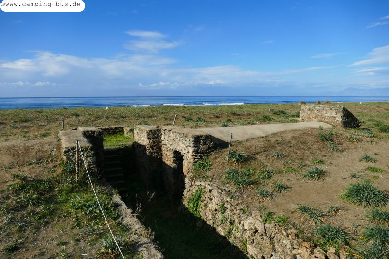 Beim Strandspaziergang stelle ich erstaunt fest, dass es noch mehr Wohnmobile in Torre di Paestum gibt. Sie stehen etwas versteckt zwischen Bäumen und Sträuchern hinter dem Strand. Wir hatten bisher nur geschlossene Camping- und Stellplätze gesehen.