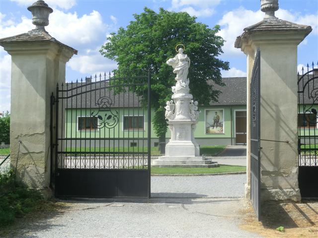 Am Waldrand erinnert ein Kriegsgräberfriedhof ... ... an die Toten der beiden Weltkriege. Mehrere gut ausgeschilderte Rad- und Wanderwege führen hier vorbei. "... hier läuft das Waldviertler Hügelland auf "Weinviertler Boden" aus." steht auf einer der Informationstafeln ... ... und dies zeigt sich hier in der von Bäumen umgebenen Mischkultur von Wein und Kamille hinter der blühenden Wildrose.